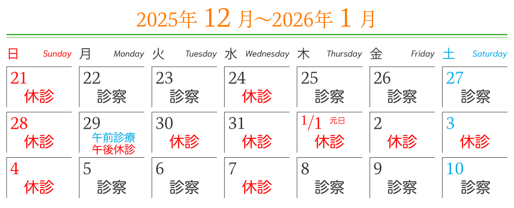 年末年始休診のお知らせ 公開済み: 2025-12-09更新: 2025-12-09作成者: くりた内科クリニックカテゴリー: お知らせ 2025年12月29日(月)午後から2026年1月4日(日)まで年末年始の休診とさせていただきます。 12月29日(月)の午前は診療を行います。 1月5日(月)から通常診療いたします。 ご不便をおかけいたしますが、よろしくお願いいたします。
